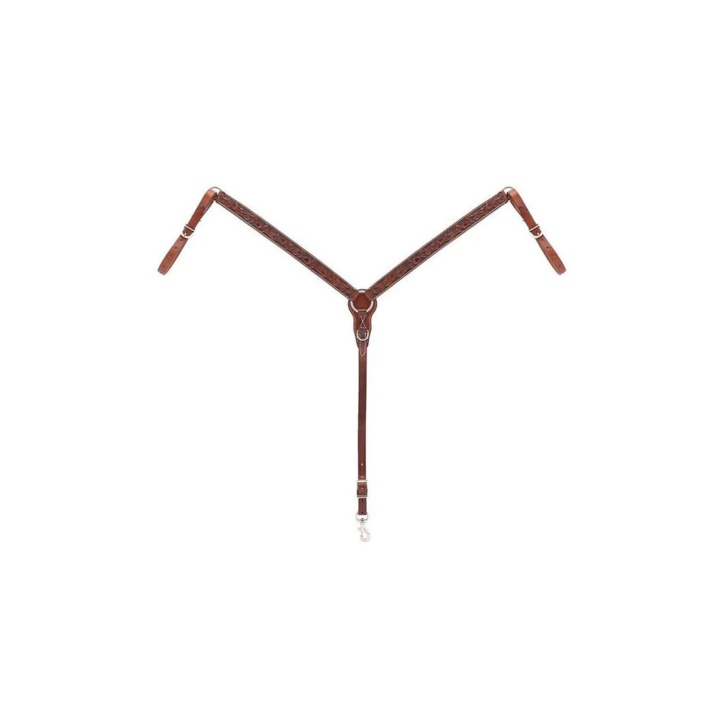- The intricate carved floral design of this leather breast collar is highlighted with black stain for a stylish look